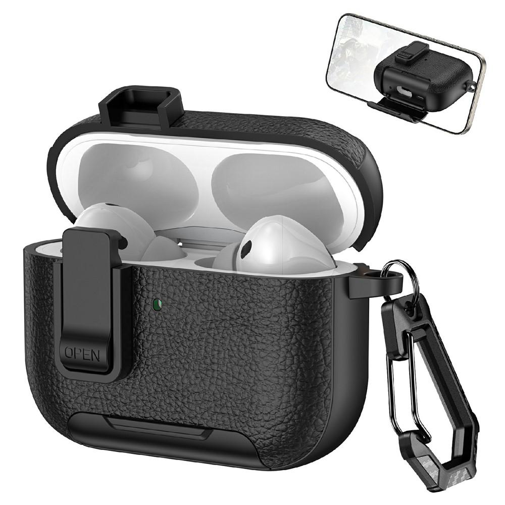AirPods Pro 3 Litchi Texture TPU + PC Case with Lock and Carabiner – Black