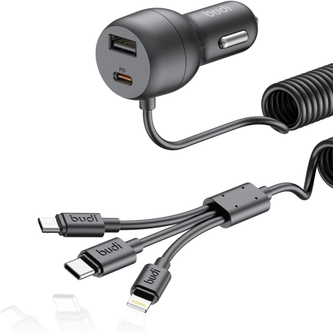 Budi 35W Car Charger Spring Retractable 3-in-1 Cable – Black CC107T3B