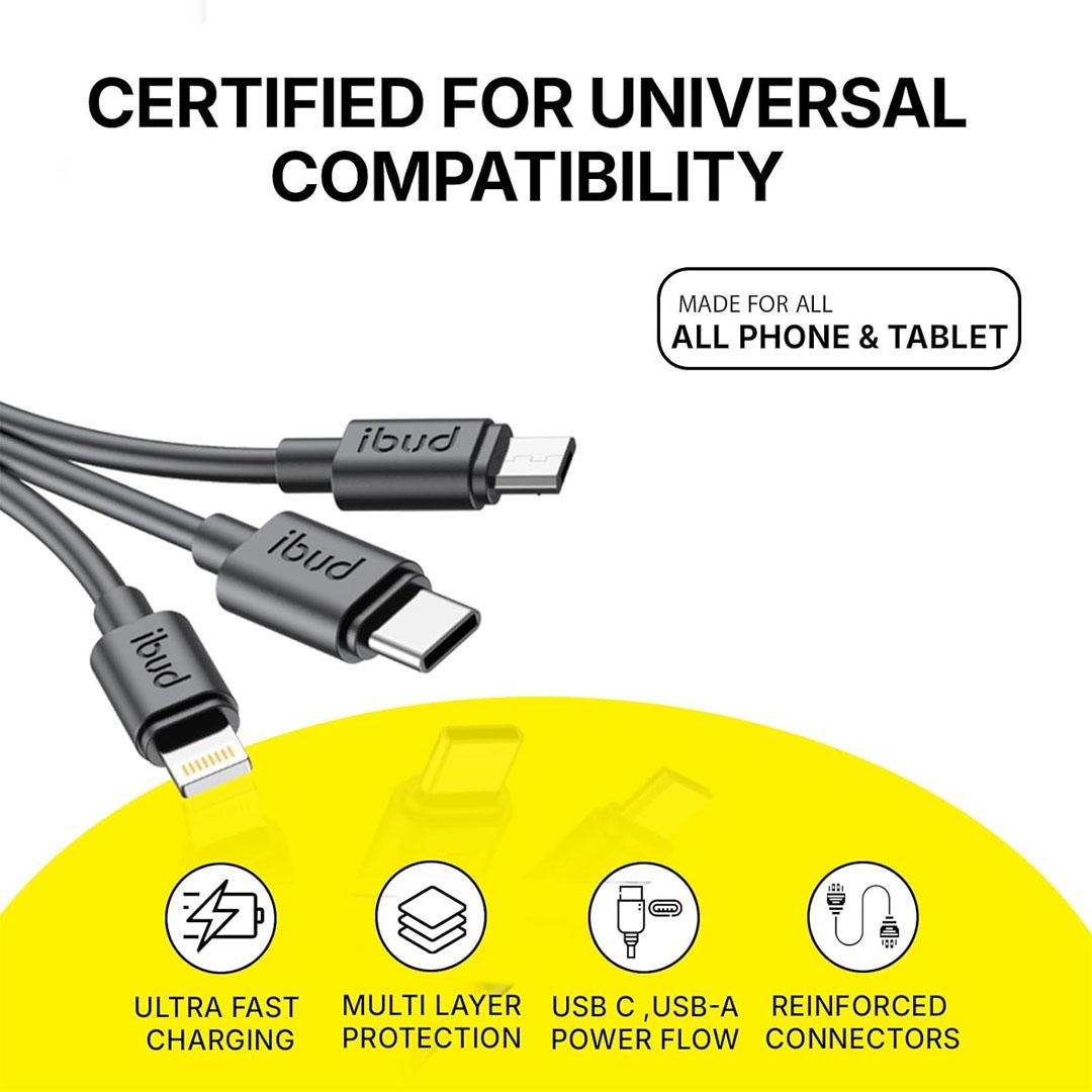 Specification: Budi 35W Car Charger Spring Retractable 3-in-1 Cable – Black CC107T3B