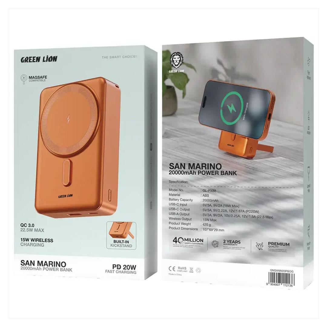 Specification: Green Lion SAN MARINO 20000mAh PD 20W MagSafe Power Bank + KickStand – Orange GNSANM20PBOG