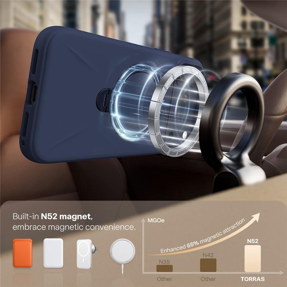 • Features a magnetic ring kickstand that is aligned for compatibility with MagSafe chargers, enabling easy wireless charging and stable hands-free use.