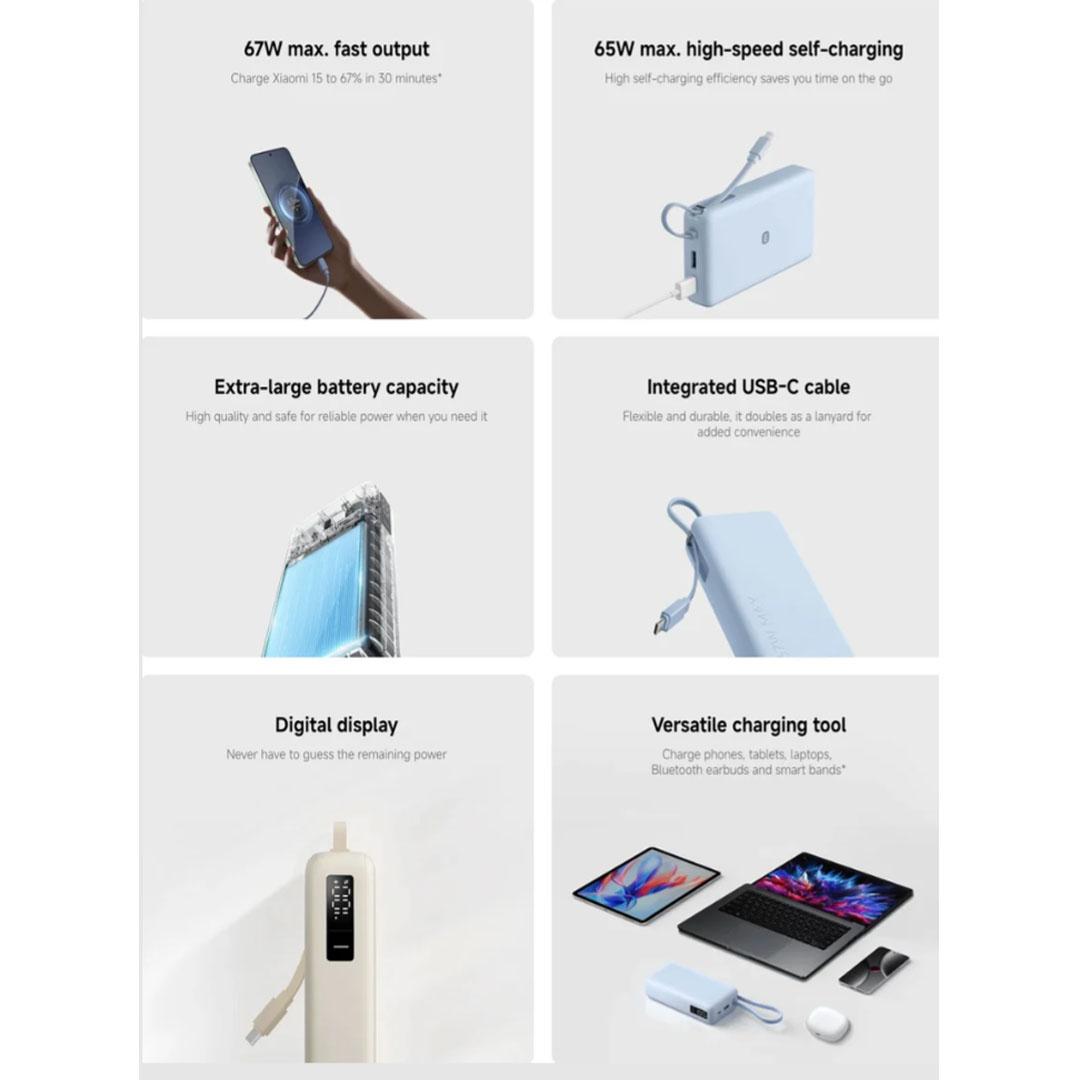 The Xiaomi 67W Power Bank 20000 with Integrated Cable offers a high-capacity 12,000mAh lithium-ion battery providing 74.37Wh of energy in a compact, durable design measuring 140 × 72 × 31.2 mm and weighing 415g. Equipped with multiple output ports, including USB-C and USB-A, it supports fast charging up to 67W, with flexible voltage and current options for optimized device compatibility. Its dual USB-C outputs and USB-A port deliver efficient multi-device charging, making it ideal for professionals requiring reliable, high-speed power in a portable form.