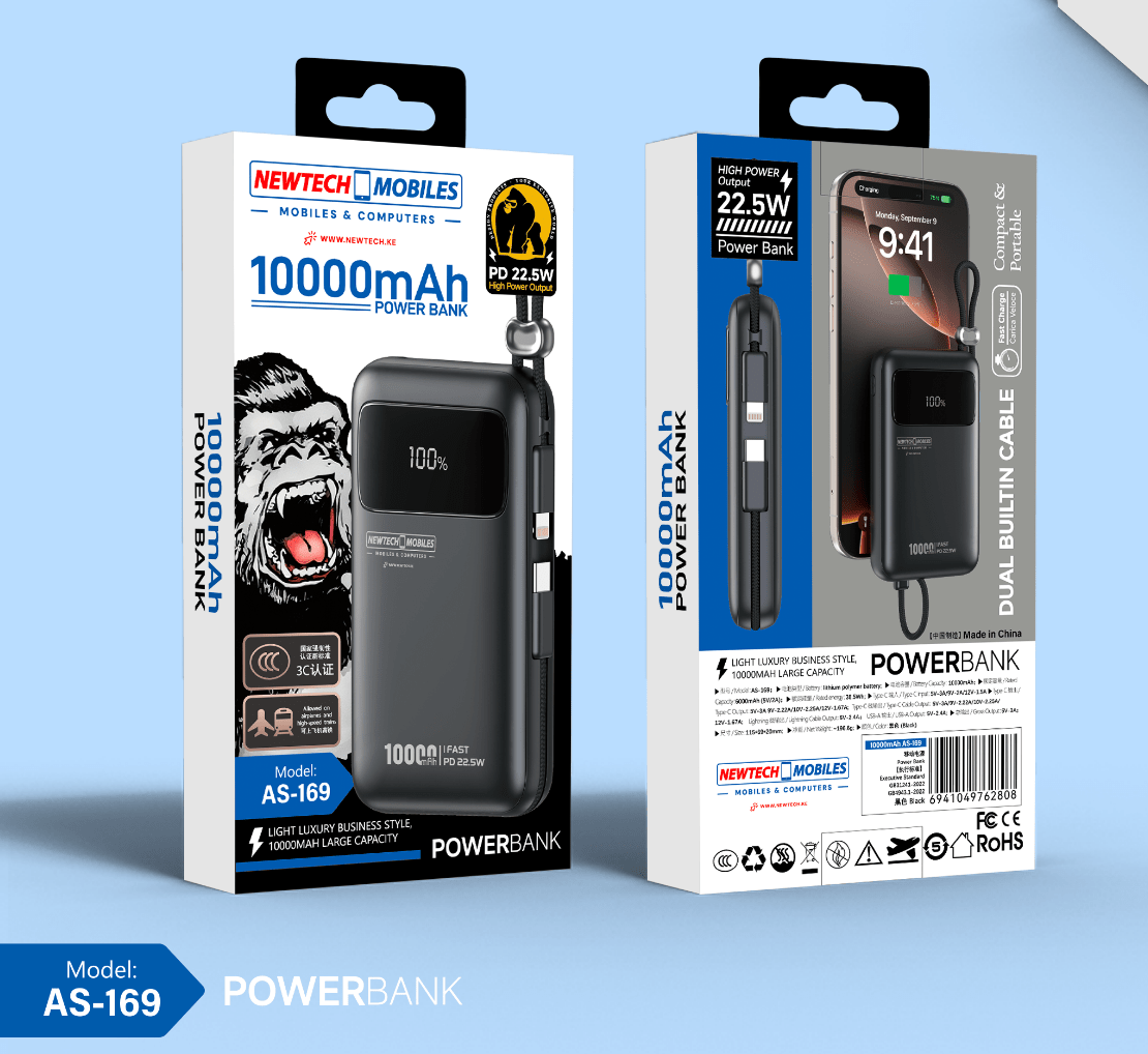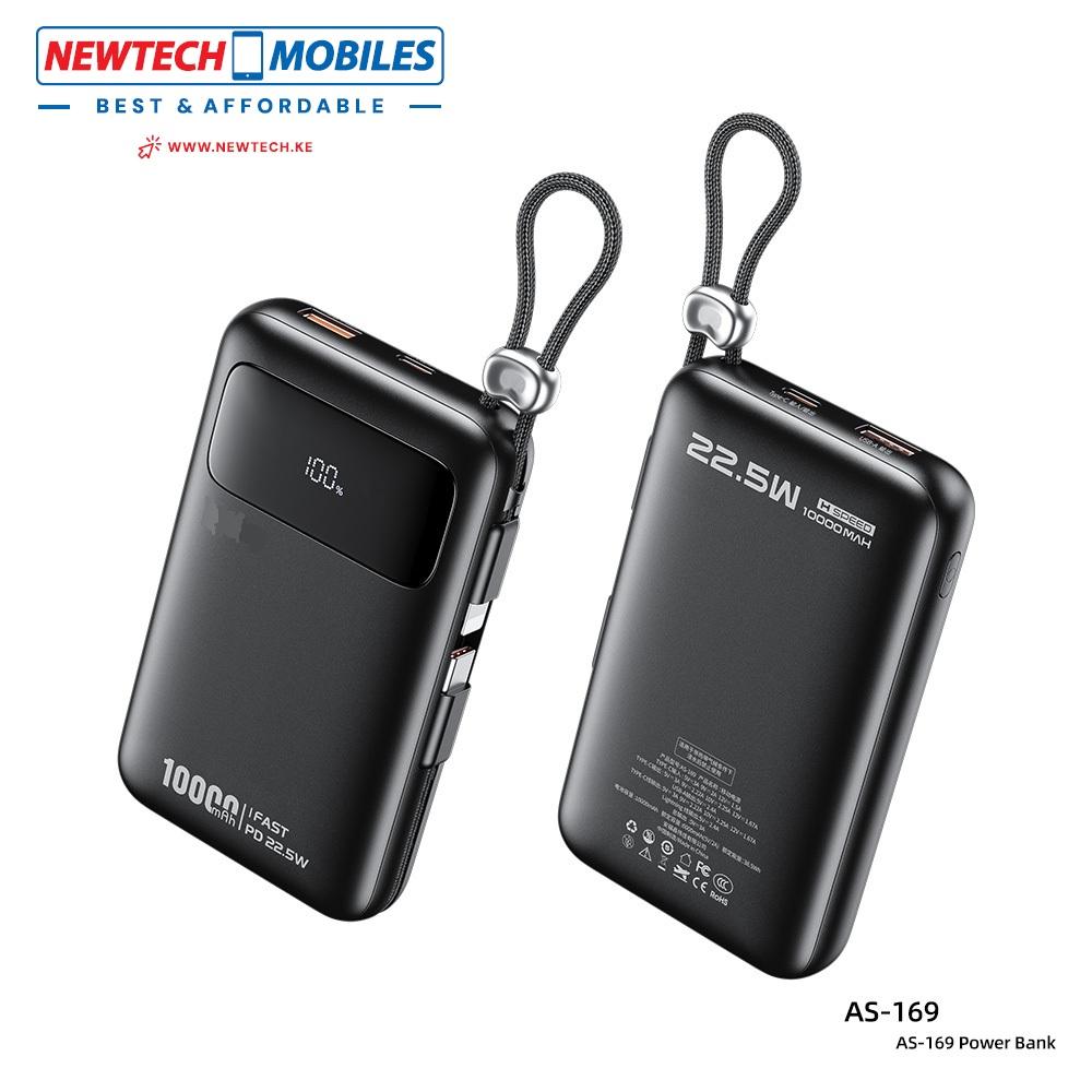 NewTech AS-169 10000mAh 22.5W Power Bank with Lightning & Type-C Cables – Black