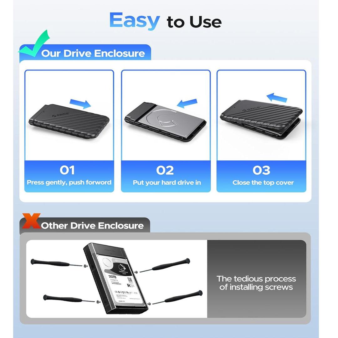 - Ideal Hard Drive Enclosure: ORICO external hard drive enclosure can easily connects 2.5 inch 7mm 9.5mm SATA I/II/III SSD & HDD to PC, laptop,TV, router, PS4, or Xbox, ideal for back up files, expanding storage or booting up old hdd/ssd and recovering important files of broken PC