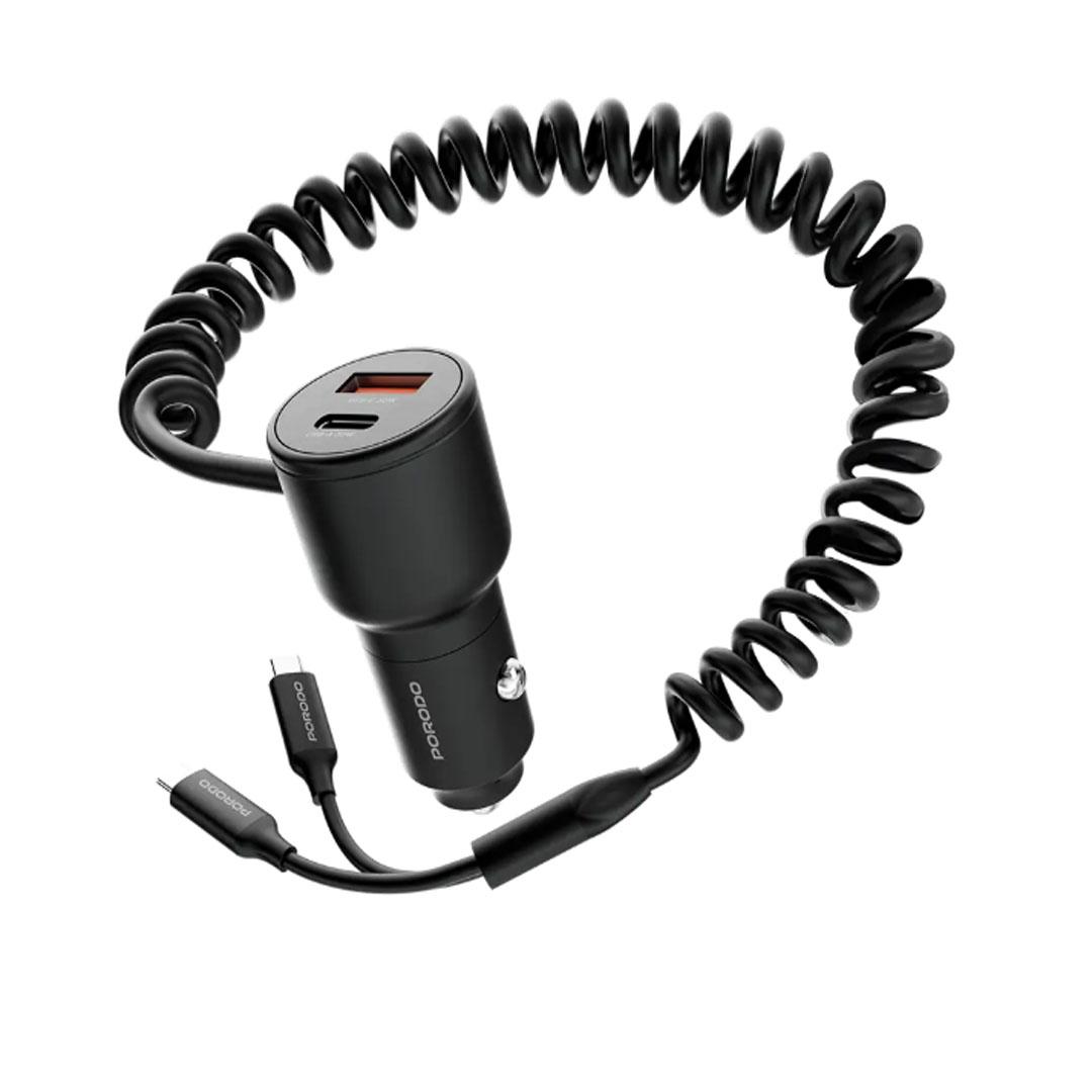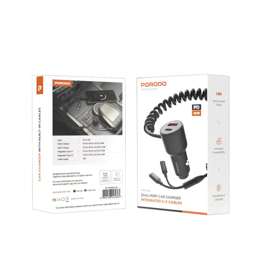 Porodo 30W Dual Port Car Charger with Integrated C+C Cable – Black PD-FWCH033-BK