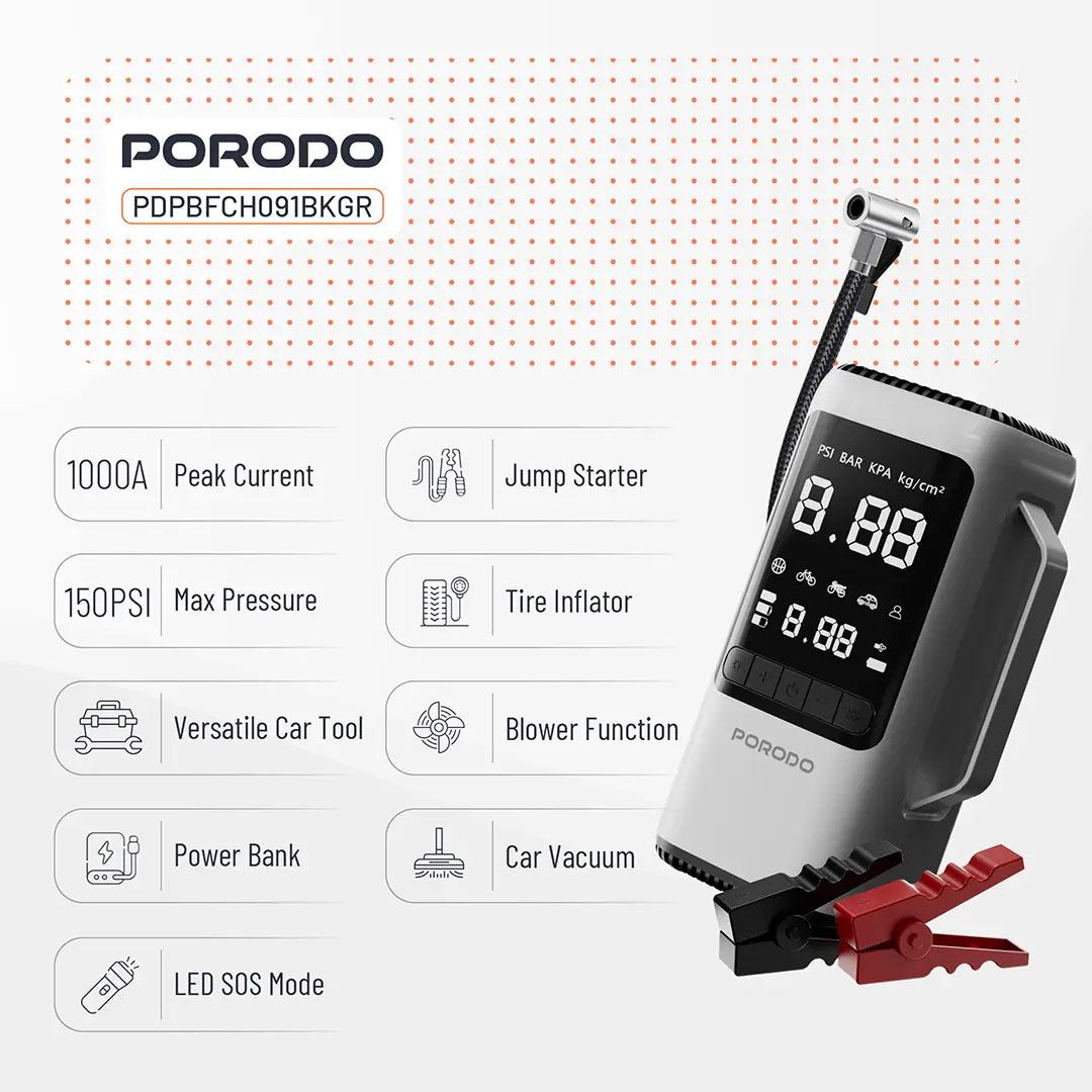 Porodo 6-In-1 Power Tool Jump Starter with Air Compressor + Vacuum & Power Bank – Black/Gray