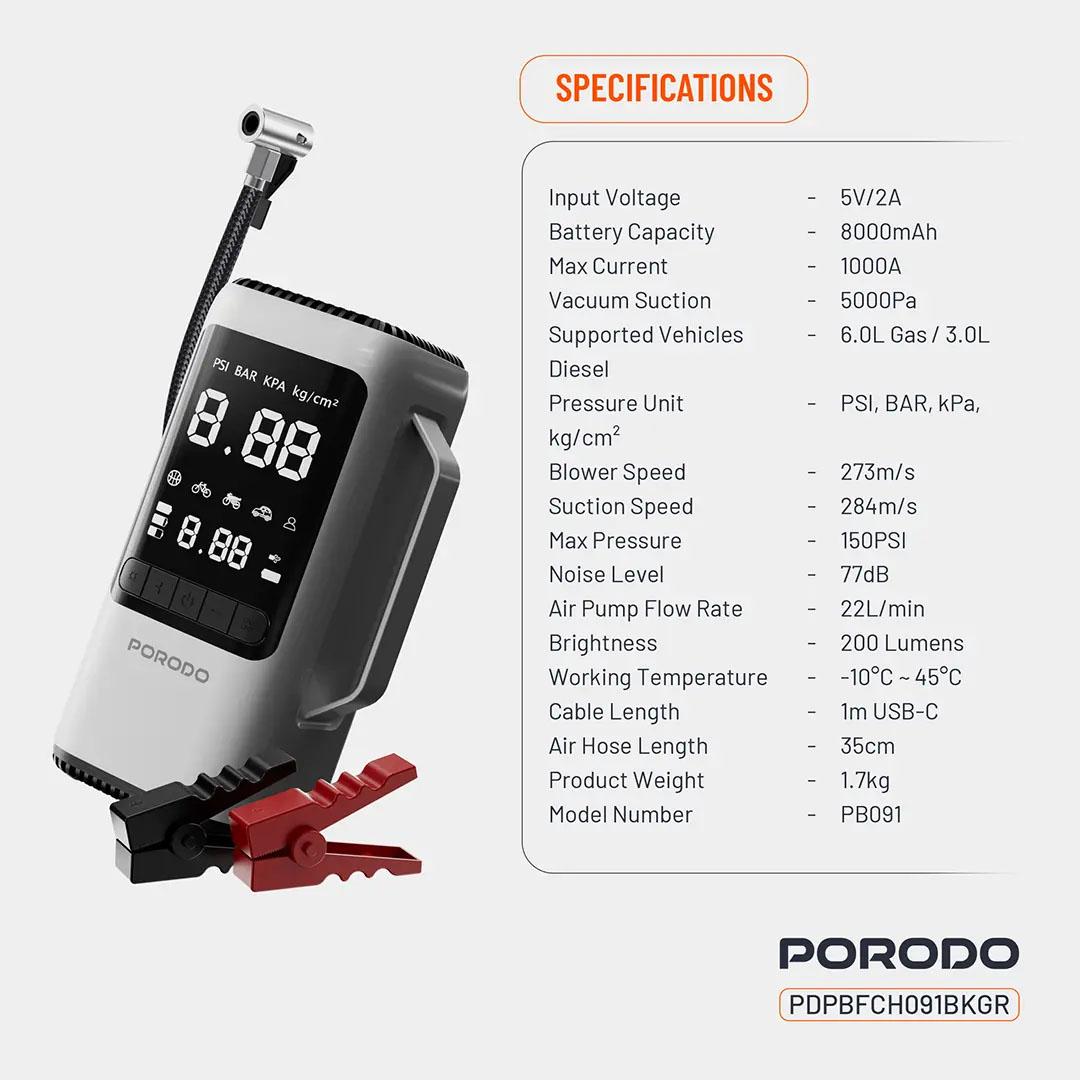 Specification: Porodo 6-In-1 Power Tool Jump Starter with Air Compressor + Vacuum & Power Bank – Black/Gray