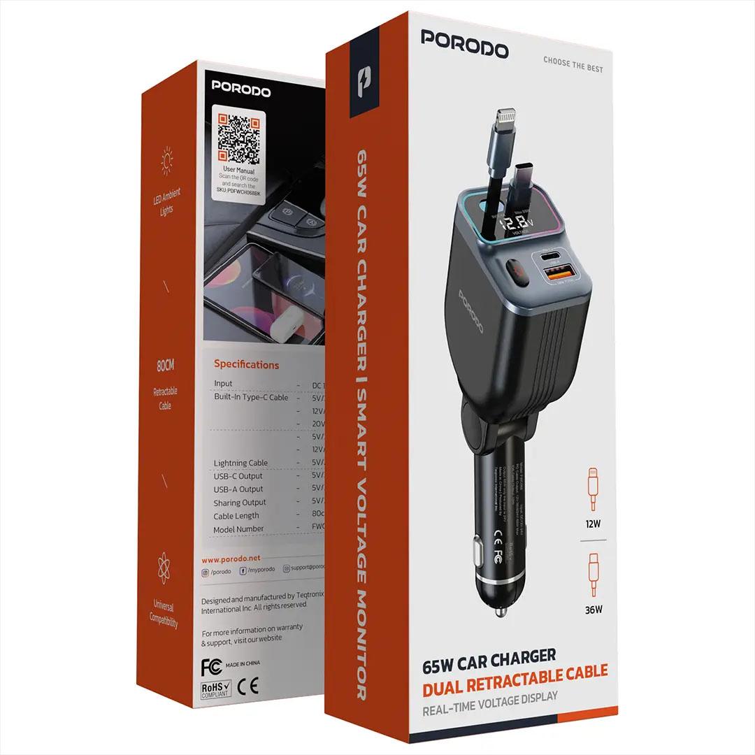 Porodo 65W Car Charger Dual Retractable Cables + USB-A / TYPE-C port – Black PDFWCH068BK