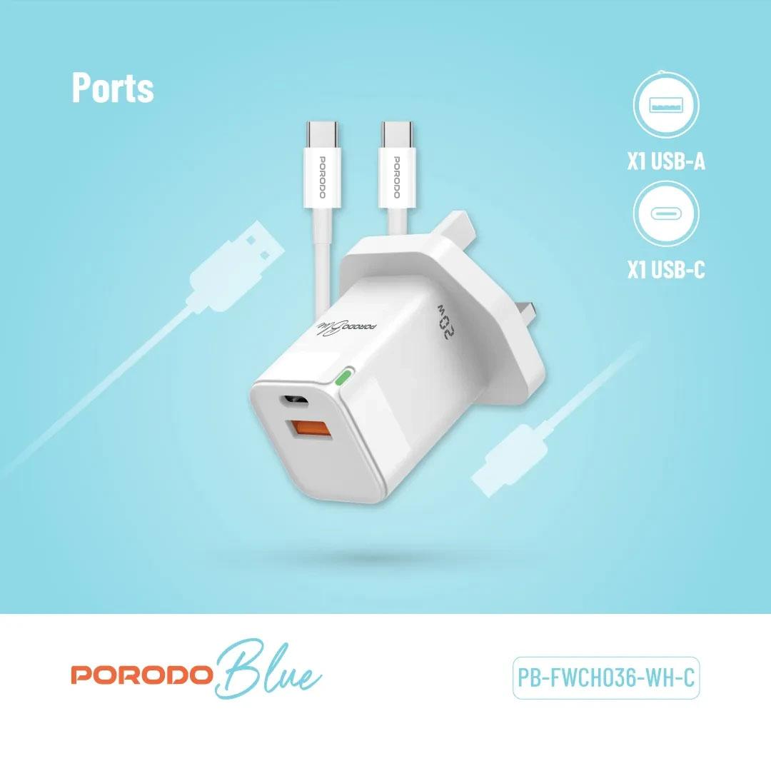 Porodo Blue 20W Charger USB-A to USB-C with 1m Type-C to C Cable – White PB-FWCH036-WH-C