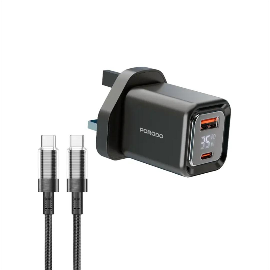 • Discover the Porodo 35W GaN Charger Black Dual Port Digital Display Quick Charger with C Cable in sleek black.