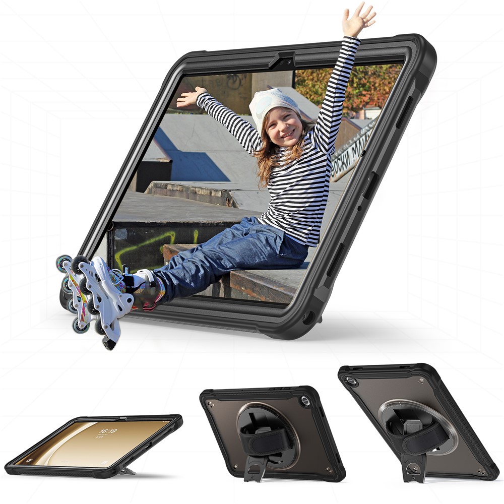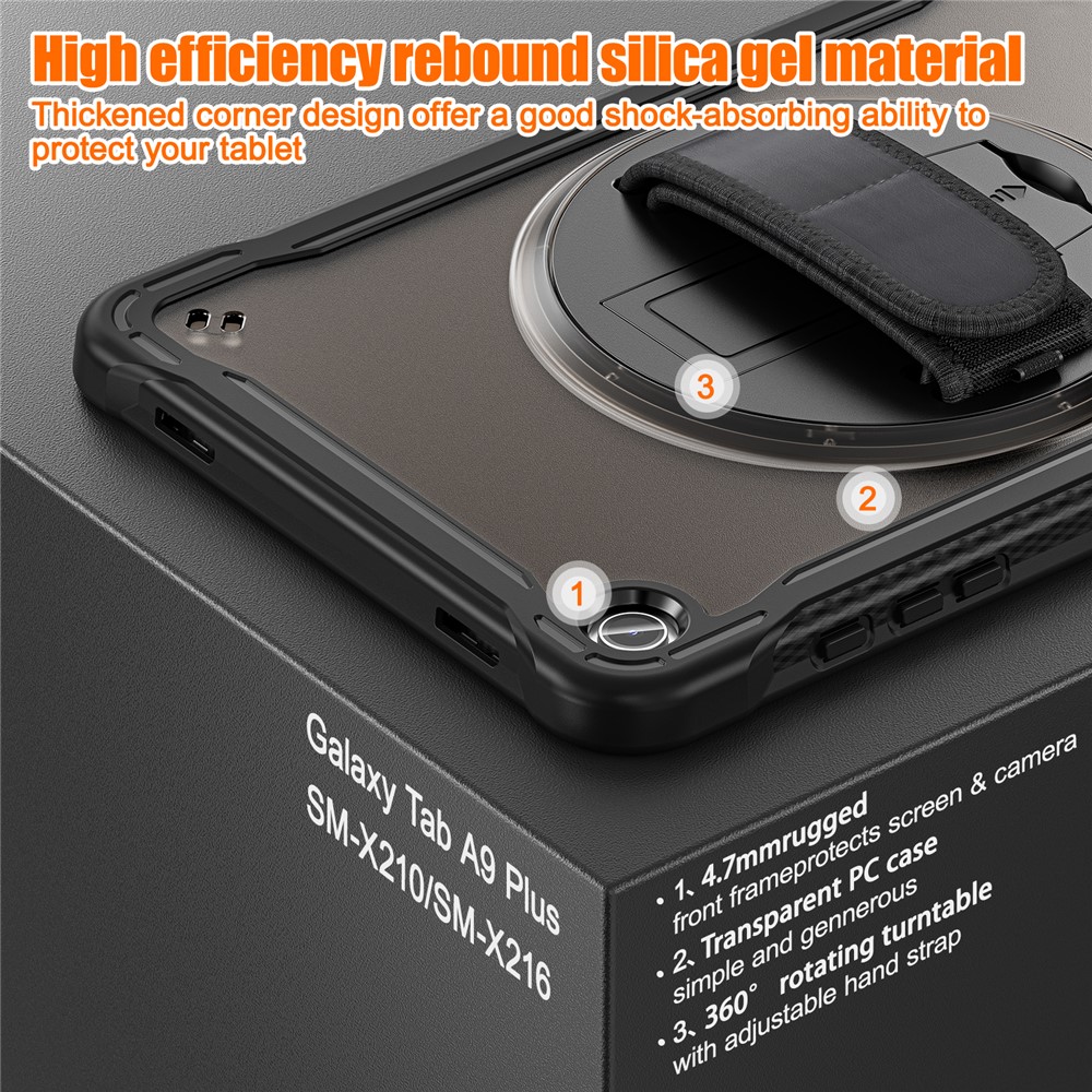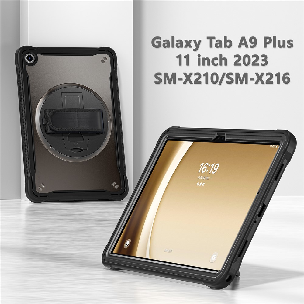 Specification: Samsung Galaxy Tab A9+ PC+TPU Rotary Kickstand Cover with Hand Strap – Transparent Black