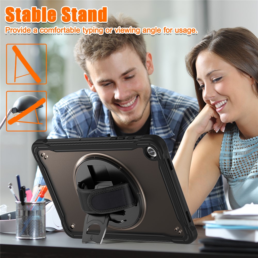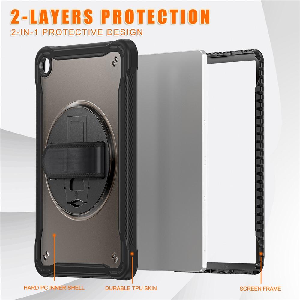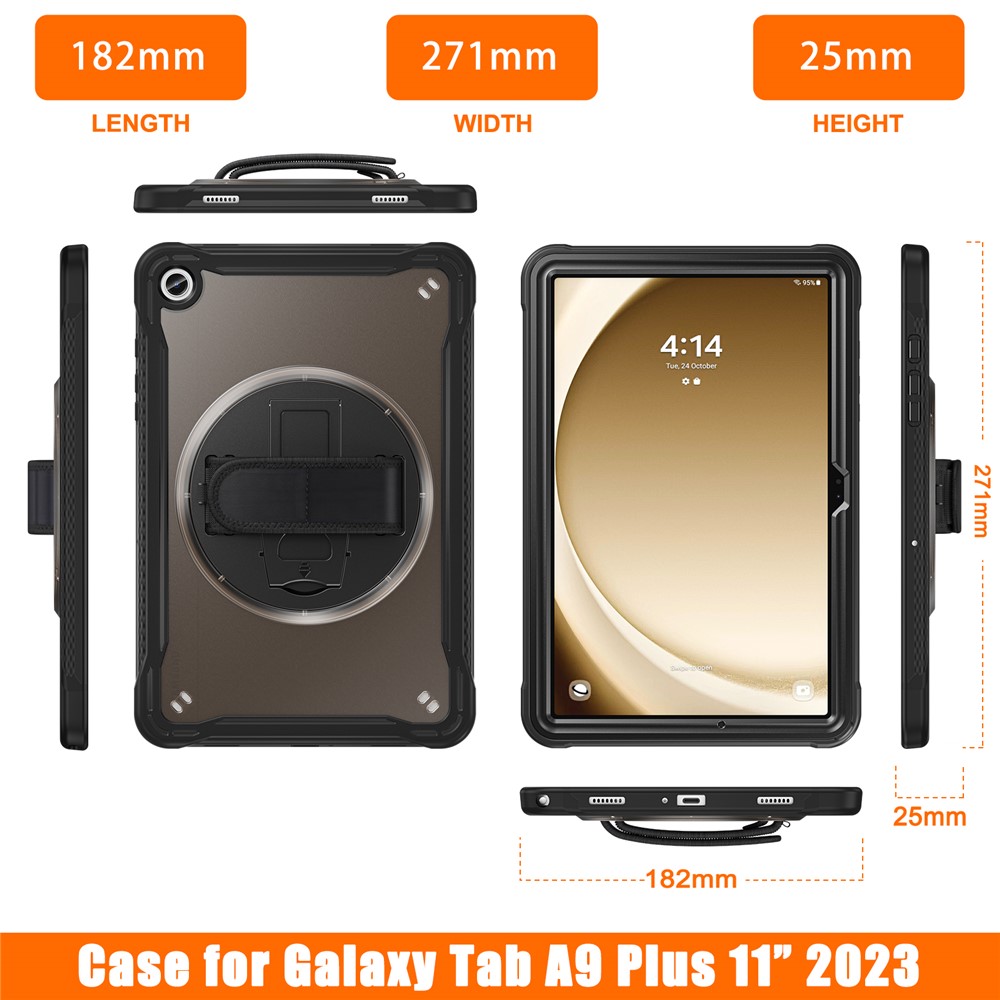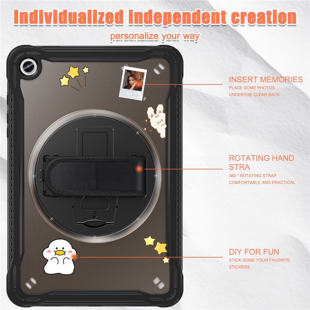 Specification: Samsung Galaxy Tab A9+ PC+TPU Rotary Kickstand Cover with Hand Strap – Transparent Black