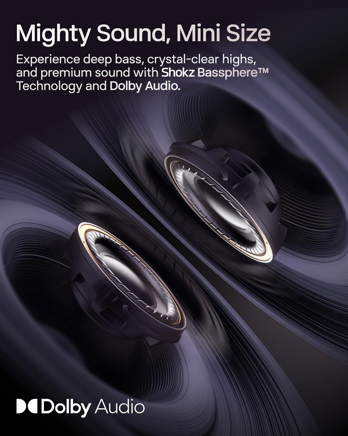 - Rich, Open-Ear Audio – Shokz signature open-ear design keeps you connected to the world while you experience the pocket-sized power of OpenDots ONE’s premium Dolby Audio and Bassphere Technology.