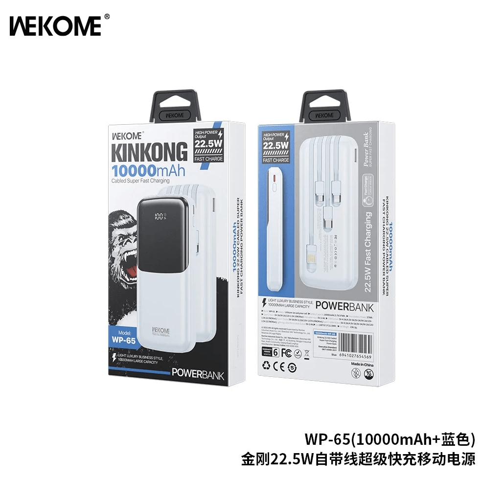 Wekome series WP-65 10000mAh 22.5W Led Display Power Bank with 4 cables – Blue