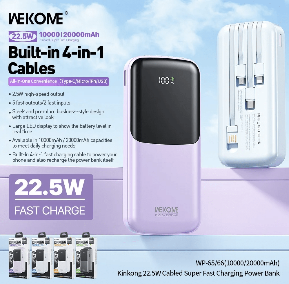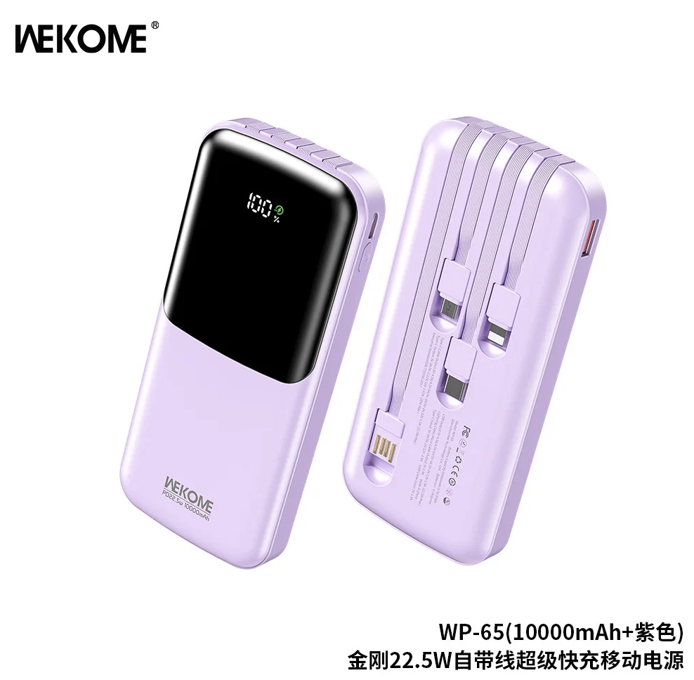 Wekome series WP-65 10000mAh 22.5W Led Display Power Bank with 4 cables – Purple