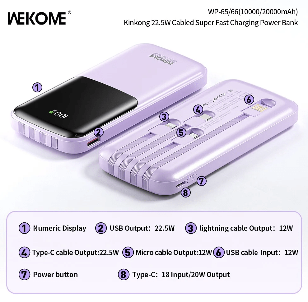 Specification: Wekome series WP-65 10000mAh 22.5W Led Display Power Bank with 4 cables – Purple
